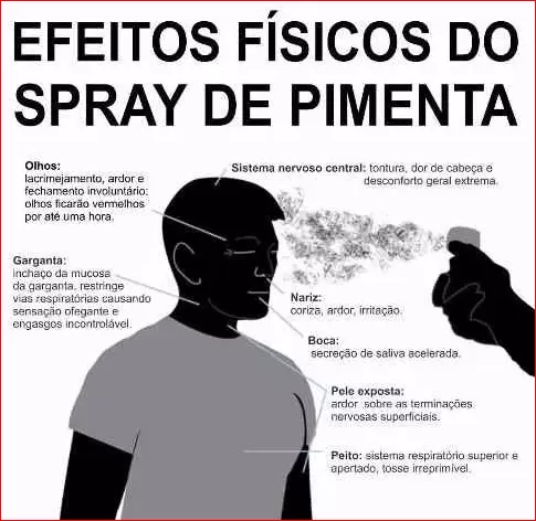 O jato de pimenta causará irritação nos olhos, nariz, boca, garganta e sistema nervoso central, retardando o agressor por um determinado tempo.